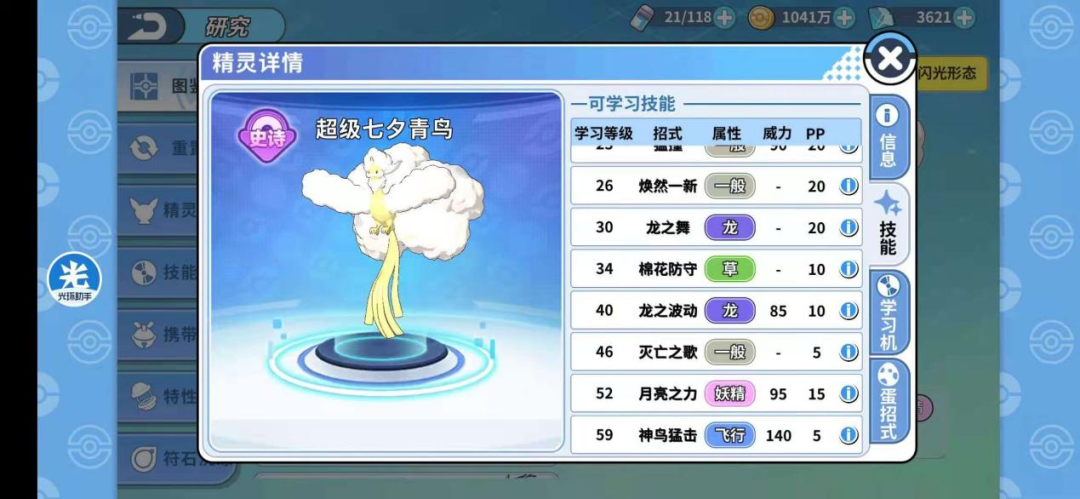 特性:自然回复(收回队伍会治愈自身异常状态),无关天气(无视天气的影响),妖精皮肤(一般属性招式会变为妖精属性,威力提升百分之20【掌机对战为第7世代】)
