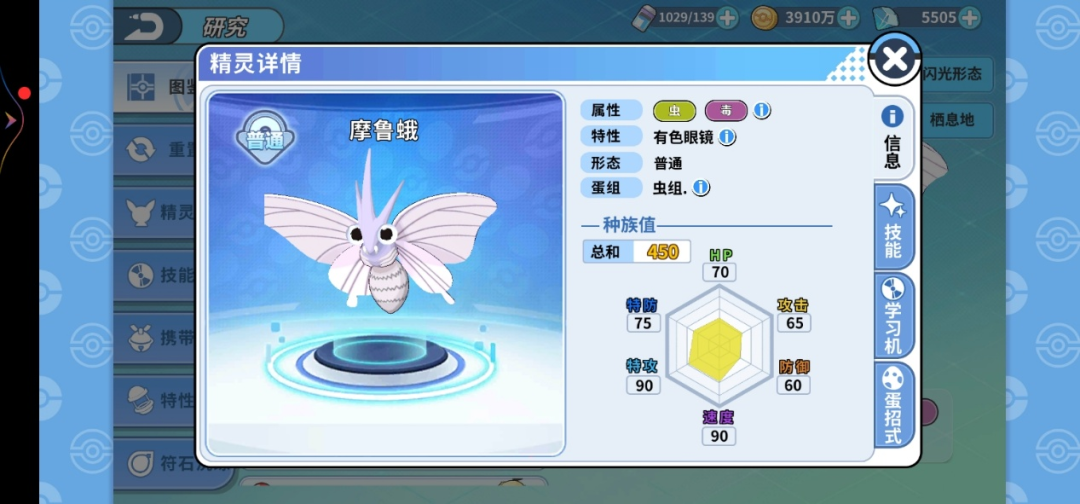 摩鲁蛾它也可以学会催眠粉 ,还有蝶舞这个神技 ,再看一下巴大蝶的种族值